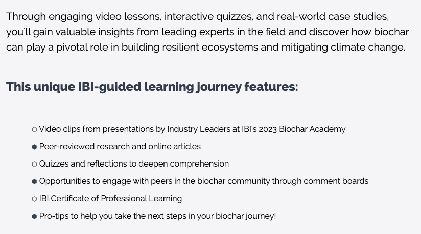 IBI’s online biochar education courses are designed to empower biochar professionals, farmers, carbon professionals, and more with the knowledge and skills to harness the incredible potential of biochar.